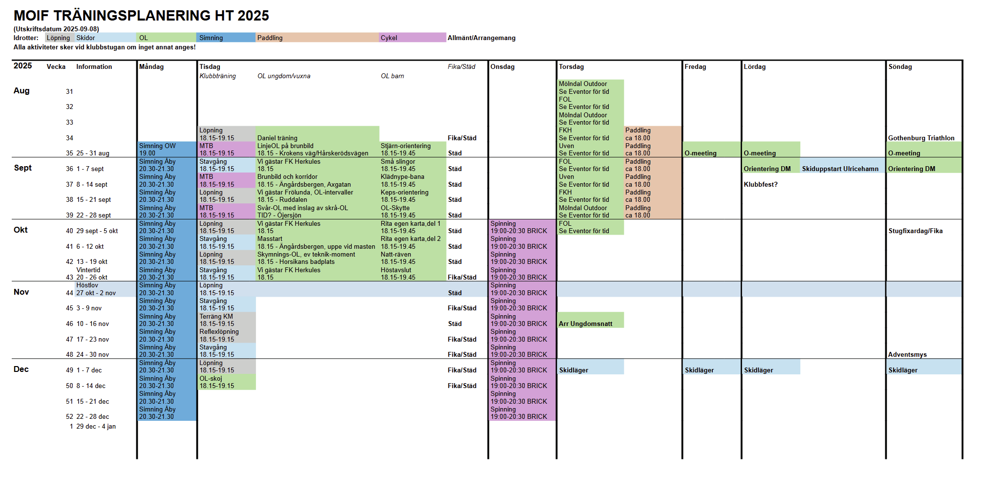 Här finns ett träningsschema som ger en översiktlig bild av träningsmöjligheterna med Mölndal Outdoor IF under nuvarande termin.